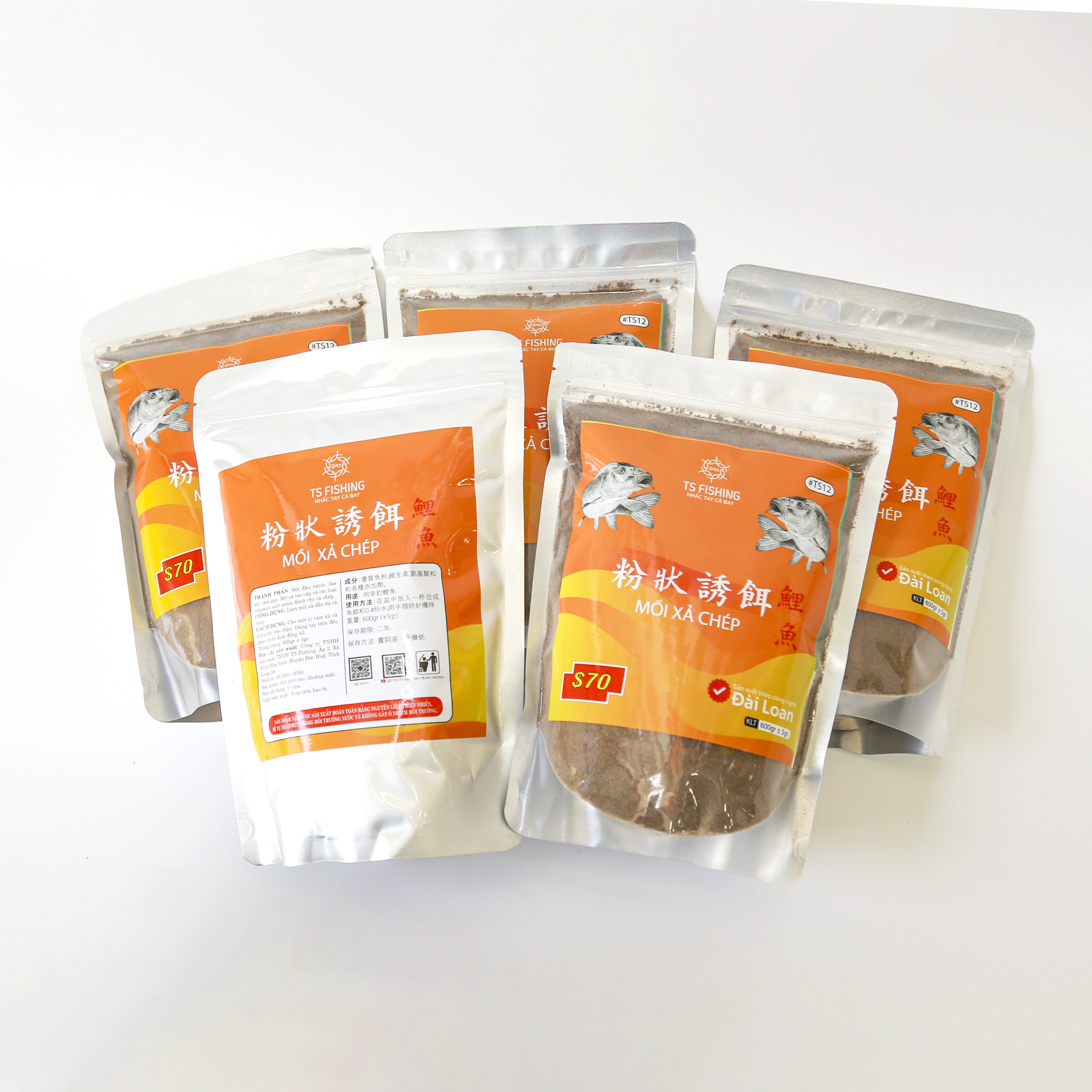 Mồi câu TS Fishing với thành phần nguyên liệu được nhập khẩu trực tiếp từ Đài Loan, với tiêu chí đơn giản và hiệu quả, sản phẩm được thiết kế để đem lại sự tiện lợi cho các cần thủ chỉ cần 1 gói mồi xả và 1 gói mồi câu pha với nước sông hồ địa điểm. Trước khi câu cá chép, bạn cần phải sử dụng lượng mồi xả vừa đủ để dụ cá tìm đến khu vực thả câu. Lựa chọn mồi xả cá chép với mùi lan tỏa cao là ưu tiên hàng đầu, có tính dẫn dụ tốt và thu hút đúng loại cá mục tiêu.