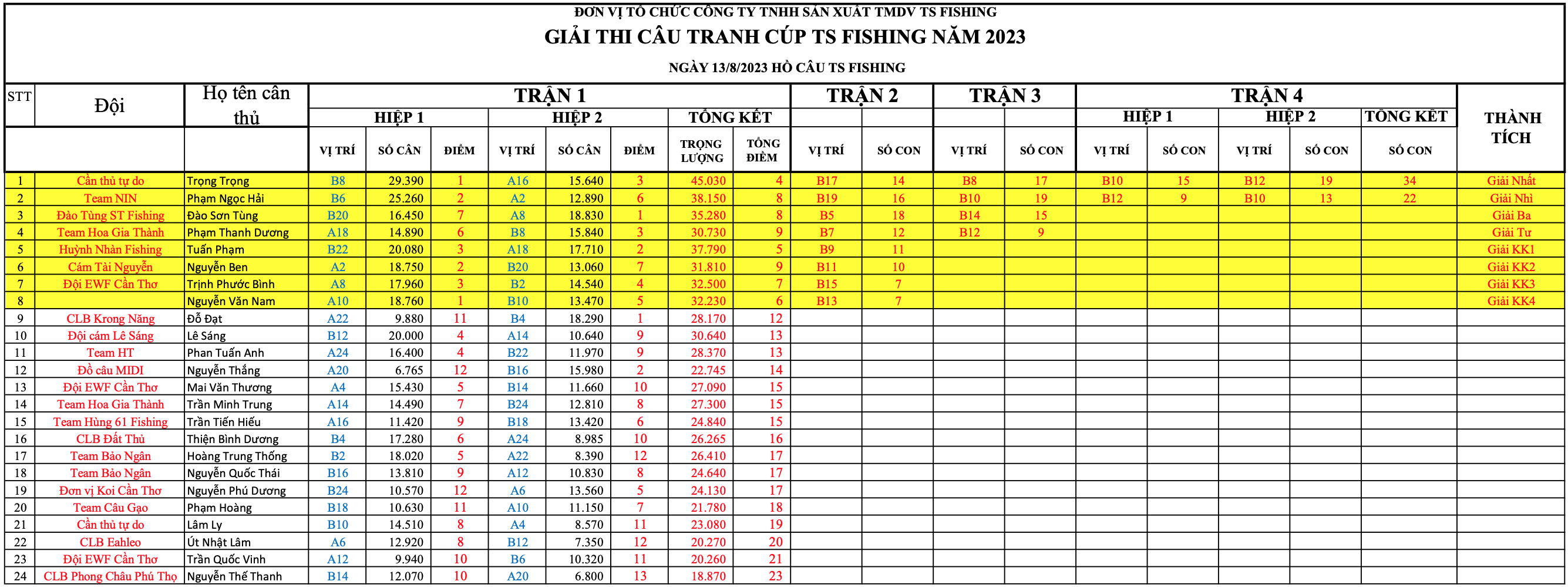 Danh sách cần thủ tham dự và kết quả thi đấu ngày 13/8/2023 - Giải Câu Tranh Cúp TS Fishing 2023