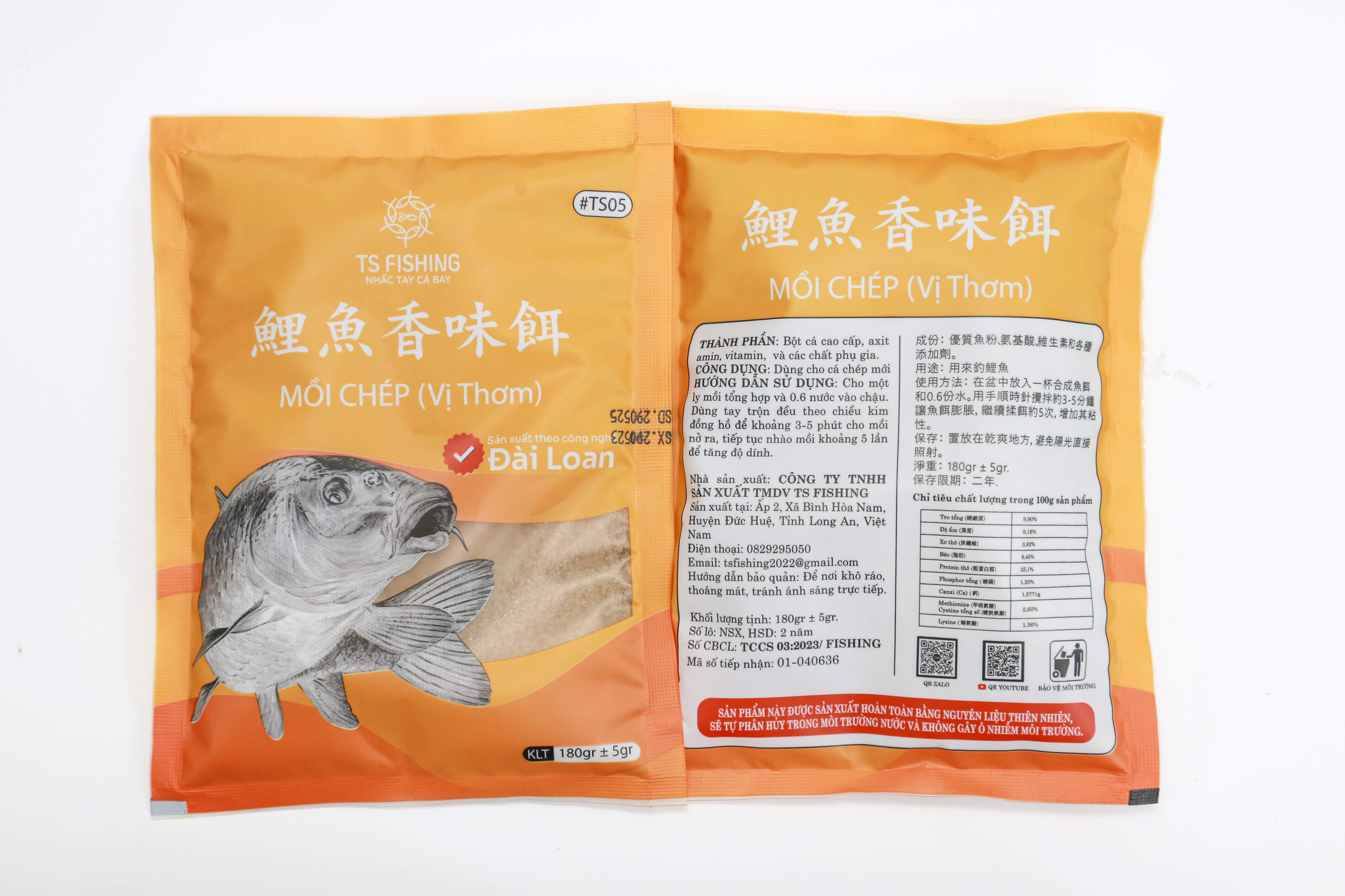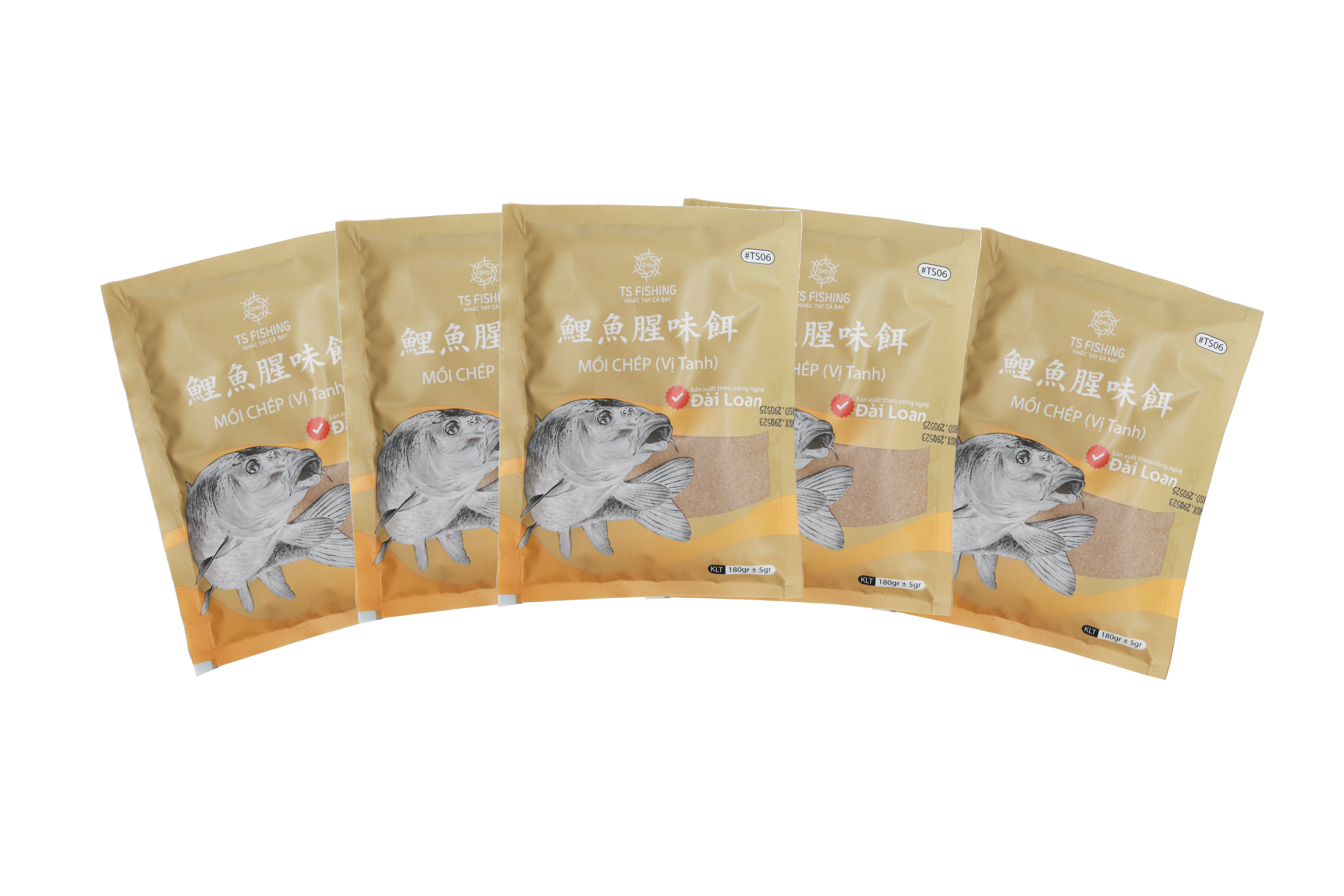 Dựa vào thói quen và đặc tính của cá chép, mồi câu cá chép vị thơm - TS05 và mồi câu cá chép vị tanh - TS06 đã được TS Fishing nghiên cứu công thức với khả năng hấp dẫn cá nhanh chóng và giữ cá trong vùng câu lâu thông qua nguồn nguyên liệu chất lượng và khâu sản xuất được giám sát chặt chẽ. Sản phẩm này đa dạng và phù hợp cho nhiều loại cá nước ngọt phổ biến tại Việt Nam, trong đó có cá chép.
