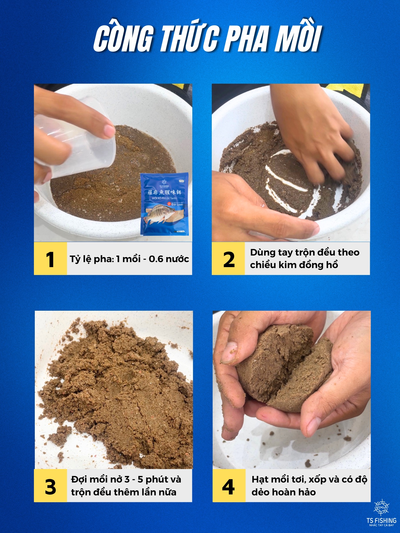CÁCH DÙNG: Cho một li mồi tổng hợp và 0.6 nước vào chậu. Dùng tay trộn đều theo chiều kim đồng hồ để khoảng 3-5 phút cho mồi nở ra, tiếp tục nhào mồi khoảng 5 lần để tăng độ dính.