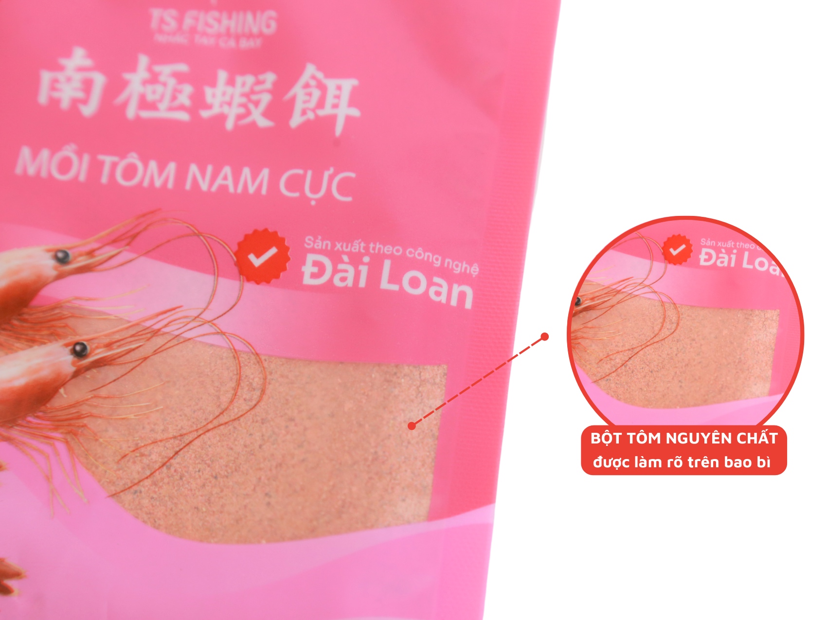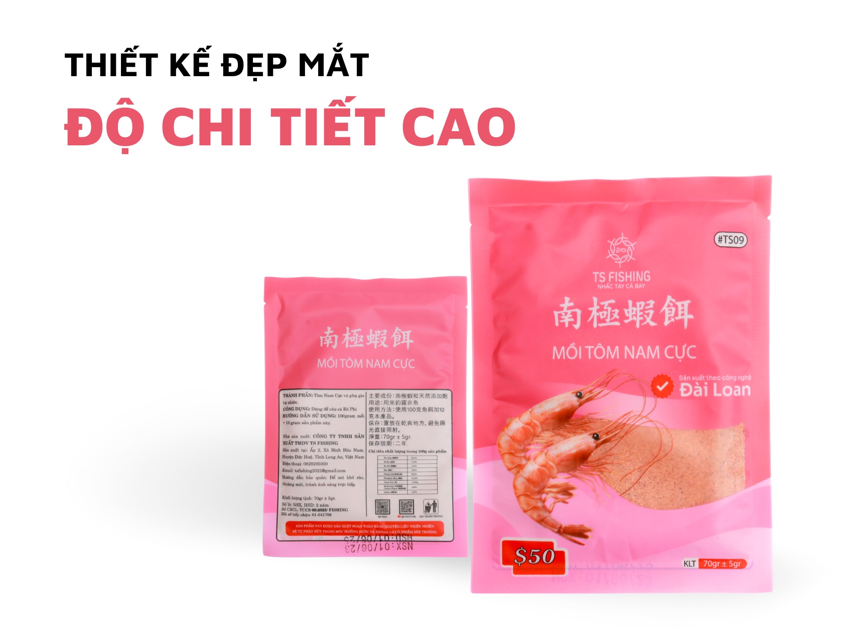Mồi phụ gia tôm nam cực là một sản phẩm khác mà TS Fishing đã đạt được sự đột phá trong thiết kế bao bì. Chúng tôi đã thực hiện sự thay đổi về bố cục thiết kế và chi tiết gói mồi. Kết quả là một thiết kế đẹp mắt và dễ nhìn hơn, tạo ấn tượng mạnh mẽ cho người sử dụng.